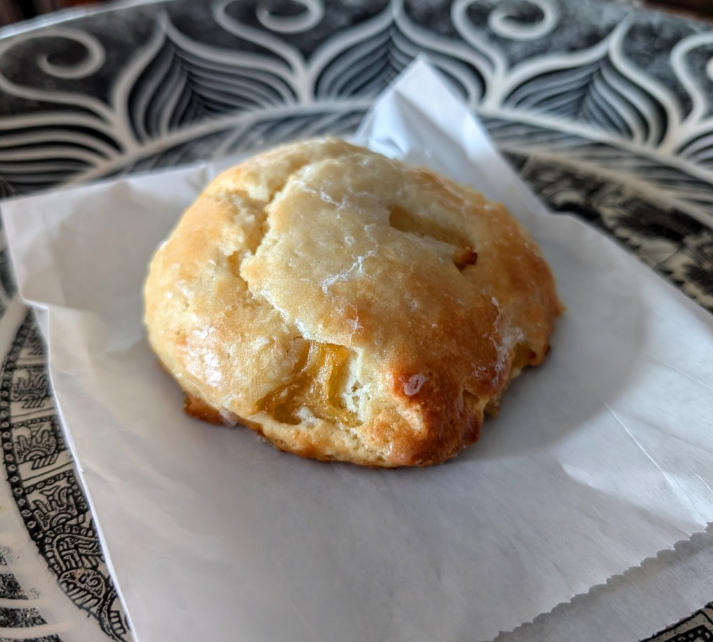 As it was a bakery, I did have to get some sort of sweet baked good and decided on a pineapple scone. I know I must have had scones before at some point (I did live in England for a few years as a child) but I either don’t remember them at all, or this scone was nothing like what the British scones are. The pineapple flavor was nice and it has a nice sweet coating or some sort of sugary glaze. My problem was that the dough itself was that dense dry dough one would use for the biscuits in biscuits and gravy. Biscuits that are definitely more savory than sweet. Biscuits that I never like. So it wasn’t really to my taste.