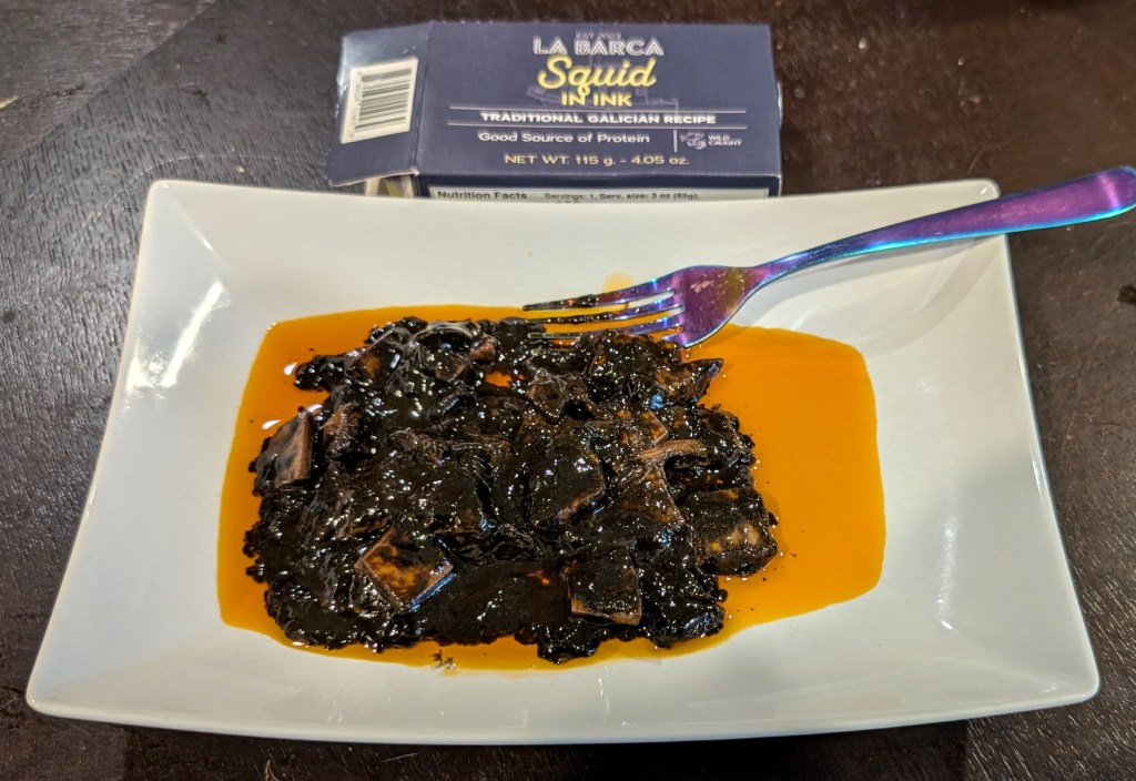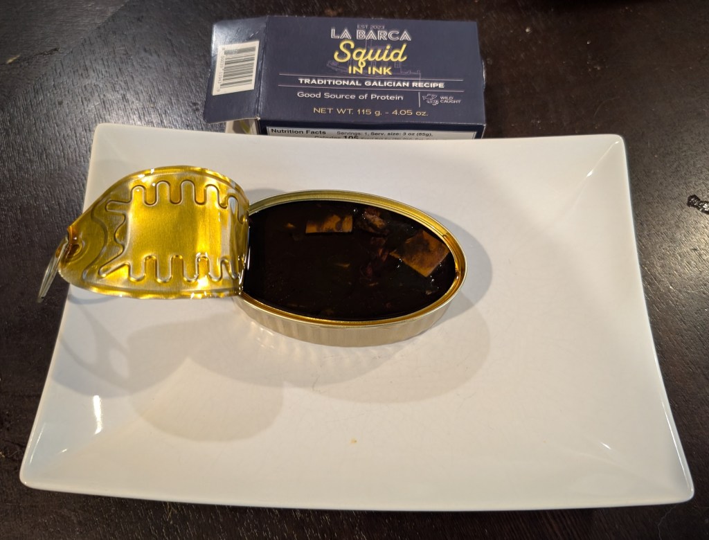 Tin 3- La Barca Squid in Ink. Visually not appetizing at all. The taste actually isn’t all that bad though I am learning that I might just not be a fan of squid ink. I have only had it a handful of times but each time it has been mildly off putting, but for different reasons? So I keep trying it. The ink in this case wasn’t too minerally, like in the past, but it still was too…strong? It is very hard for me to nail down exactly what my problem with it even is!
