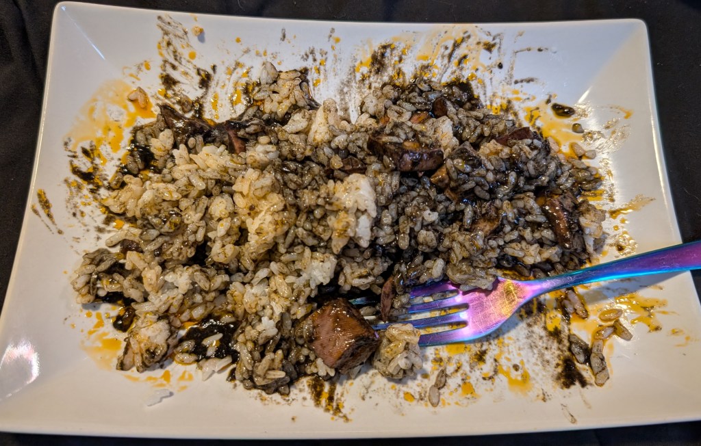 I added in some plain rice to cut the flavor a bit and that definitely helped. The squid itself has a nice squiddy flavor but more needs to be done to this one to make it a pleasurable meal in my opinion. 3/10, I can see some potential but it needs someone who knows what to pair with squid ink- and I do not.