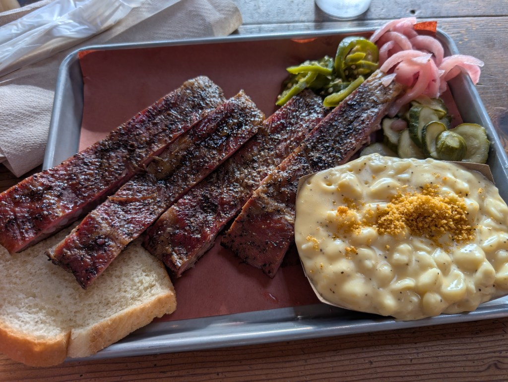For $32 you can get a whole FOUR ribs (or 1lb) and whatever the tart pickle thing is. That’s it. The bland mac and cheese is an extra charge starting at $7. First of all, I detest charging for meat by weight when it is primarily bone. Ribs, particularly spare ribs, are like 50% bone! Half of what you are being charged for is not edible. Yes, I know, all meat is by weight and I am someone who really likes chewing on bones, but charging for ribs by weight just seems so…unfair. Charge by slab like any real BBQ place. But that isn’t even really the problem. Well, yes the overall price for what you get is atrocious, but to add insult to injury, it’s not even good!